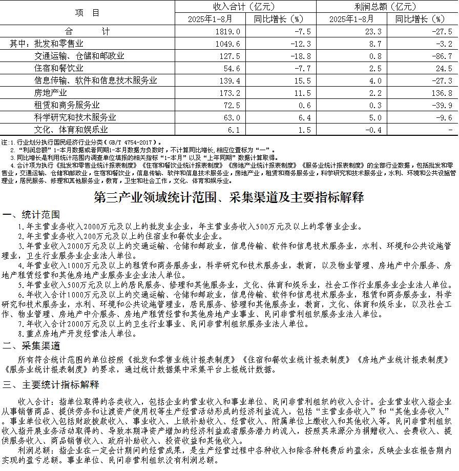 大兴区2025年1-8月规模以上第三产业法人单位主要经济指标