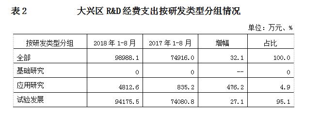 2018年1-8月,从大兴区大中型企业R&D经费内部支出类型分组看,试验发展始终占比最高,支出达9.4亿元,占全部的95.1%。应用研究支出0.5亿元,虽同比增长476.2%,但占比仍然较小,仅为4.9%。