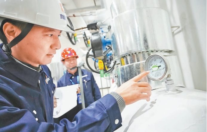 四惠地铁站不远处,京能集团所属北京热力朝二分公司地铁平台3号热力站源源不断将热力输送至通惠家园小区的居民家中。热力站内,3名头戴安全帽的热力工作人员正在对供热设备设施进行日常巡视检查。他们对一次供回水及二次供回水温度、压力、配电设施等仪器仪表参数进行检查,同时检查管道、阀门及换热设施有无泄漏,水泵运转是否正常。
